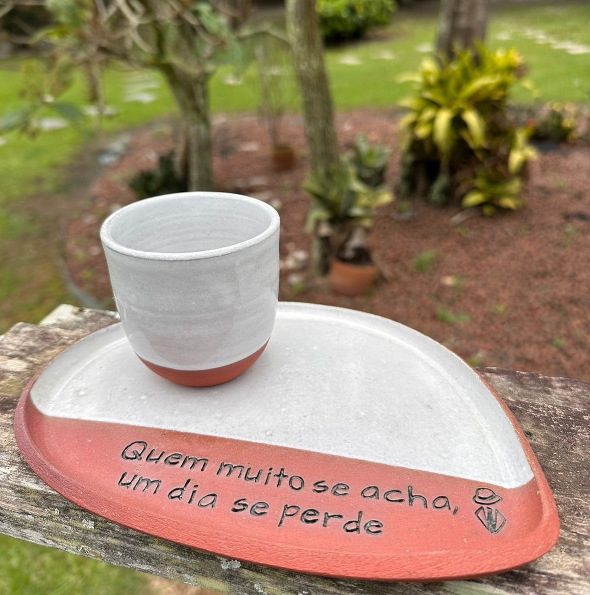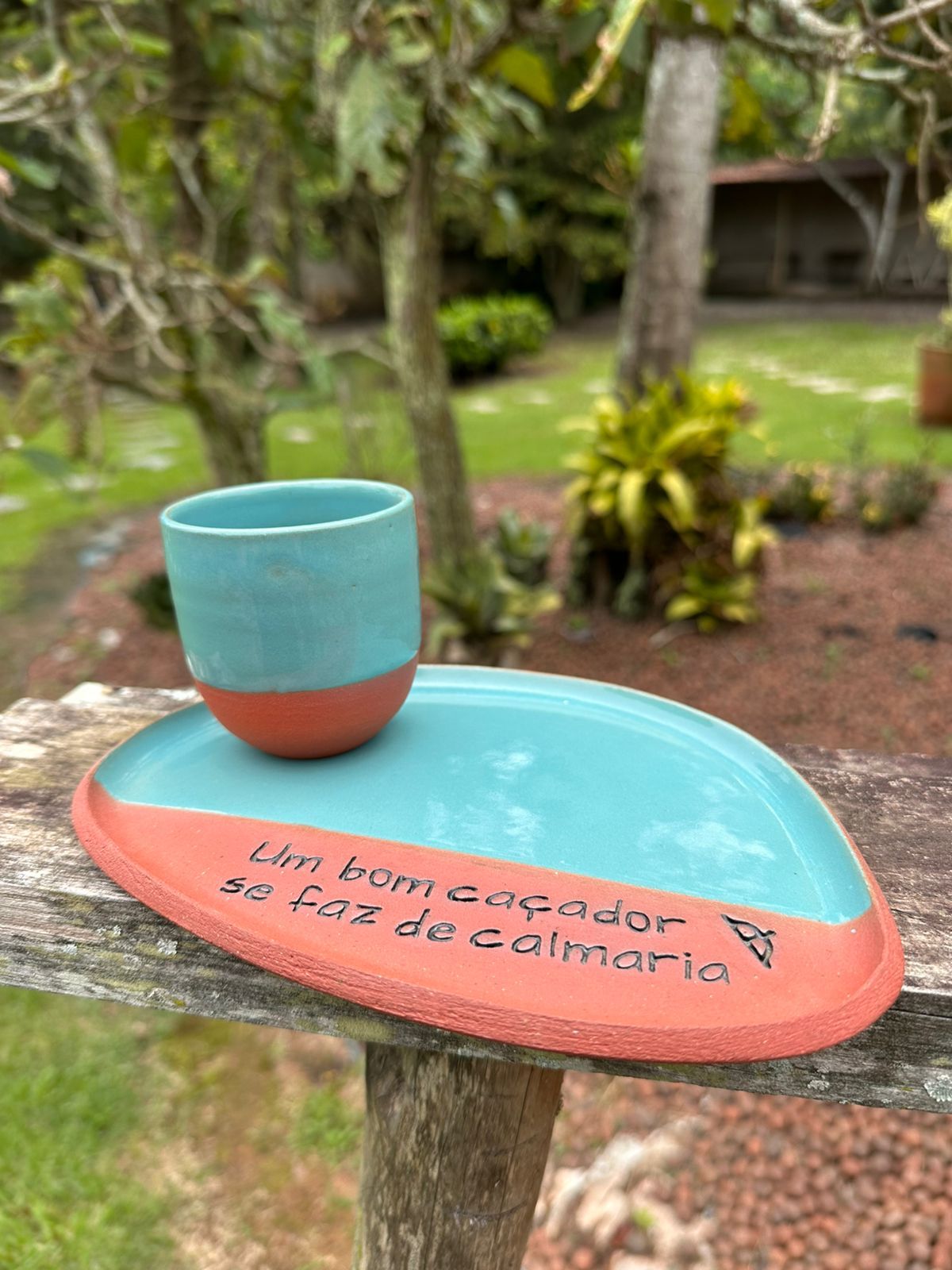 Conjunto ancestralidade com 1 copo e 1 pires, pode servir como porta vela também de cerâmica artesanal produzida em argila de alta temperatura.